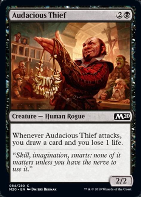 Description Whenever Audacious Thief attacks, you draw a card and you lose 1 life.Color: BlackRarity: commonType: Creature — Human Rogue