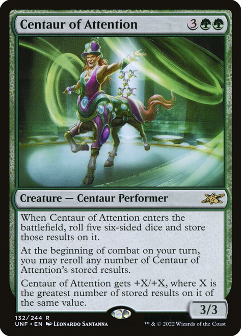When this creature enters, roll five six-sided dice and store those results on it. At the beginning of combat on your turn, you may reroll any number of this creature's stored results. This creature gets +X/+X, where X is the greatest number of stored results on it of the same value.