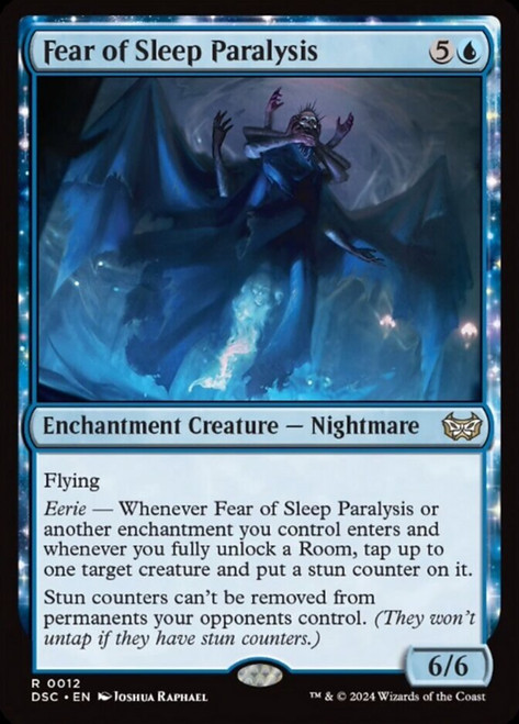 Eerie — Whenever Fear of Sleep Paralysis or another enchantment you control enters and whenever you fully unlock a Room, tap up to one target creature and put a stun counter on it.