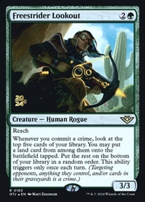 Whenever you commit a crime, look at the top five cards of your library. You may put a land card from among them onto the battlefield tapped. Put the rest on the bottom of your library in a random order. This ability triggers only once each turn. (Targeting opponents, anything they control, and/or cards in their graveyards is a crime.)