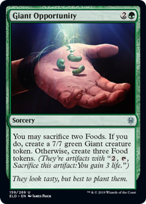 You may sacrifice two Foods. If you do, create a 7/7 green Giant creature token. Otherwise, create three Food tokens. (They're artifacts with "{2}, {T}, Sacrifice this artifact: You gain 3 life.")