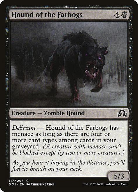Delirium — Hound of the Farbogs has menace as long as there are four or more card types among cards in your graveyard. (A creature with menace can't be blocked except by two or more creatures.)
