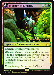 Description Journey to EternityCard Type: Legendary EnchantmentSubtype: AuraCasting Cost: Card Text: Enchant creature you controlWhen enchanted creature dies, return it to the battlefield under your control, then return Journey to Eternity to the battlefield transformed under your control.Oracle Text: Enchant creature you controlWhen enchanted creature dies, return it to the battlefield under your control, then return Journey to Eternity to the battlefield transformed under your control.Flavor Text: Every journey has its inevitable end . . .Artist: Deruchenko AlexanderAtzal, Cave of EternityCard Type: Legendary LandCard Text: (Transforms from Journey to Eternity.)Tap: Add one mana of any color to your mana pool.3BG, Tap: Return target creature card from your graveyard to the battlefield.Oracle Text: (Transforms from Journey to Eternity.)Tap: Add one mana of any color.3BG, Tap: Return target creature card from your graveyard to the battlefield.Flavor Text: . . . but every end is a new beginning.Artist: Deruchenko Alexander Rarity: Promo
