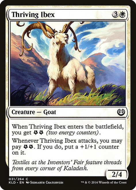 When Thriving Ibex enters the battlefield, you get {E}{E} (two energy counters).