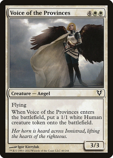 Description FlyingWhen Voice of the Provinces enters the battlefield, create a 1/1 white Human creature token.Color: WhiteRarity: commonType: Creature — Angel
