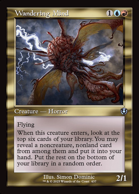 Flying When Wandering Mind enters, look at the top six cards of your library. You may reveal a noncreature, nonland card from among them and put it into your hand. Put the rest on the bottom of your library in a random order.